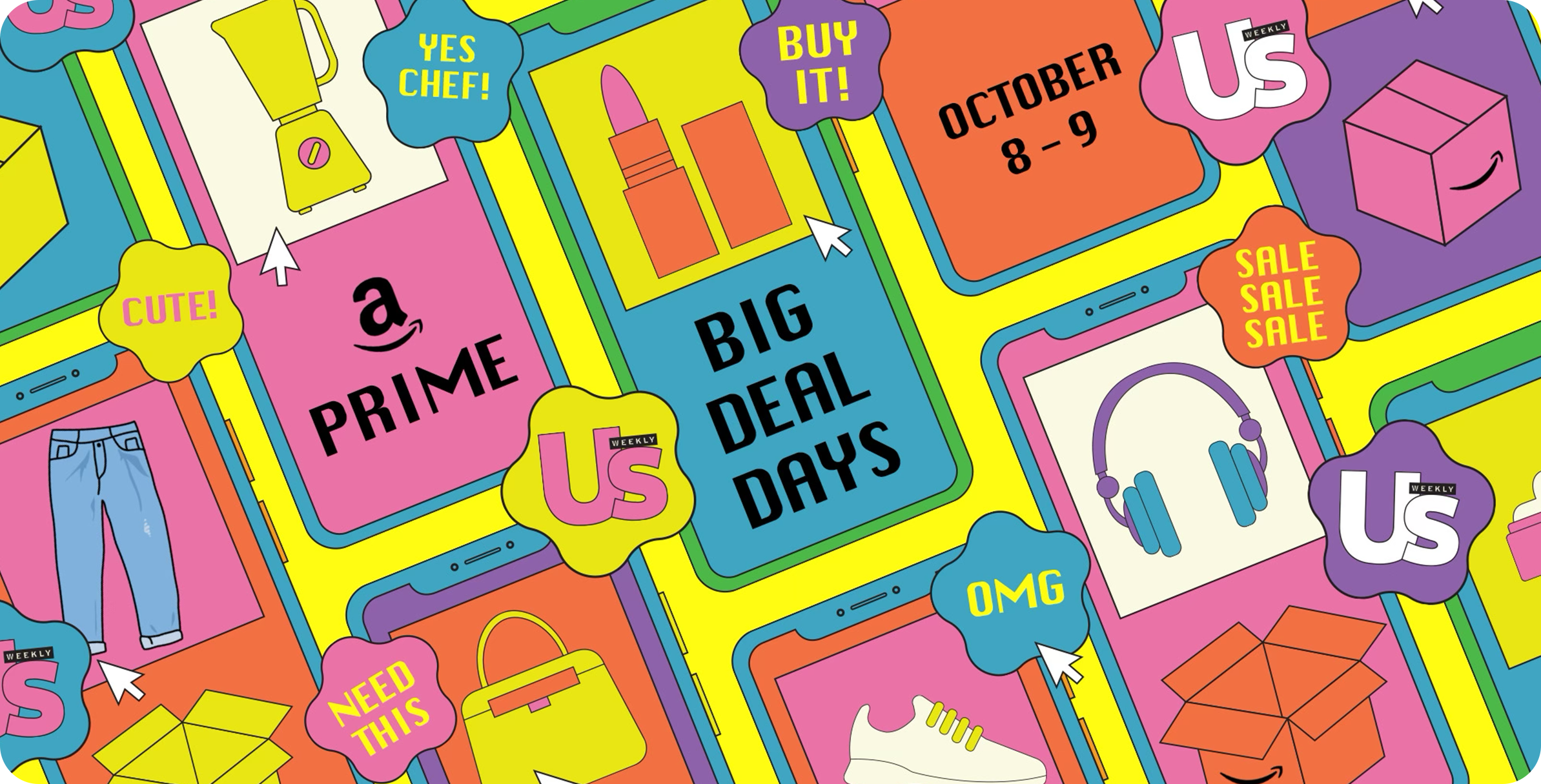 As Us Weekly's graphic designer, I concept, design, and illustrate the annual themed banner campaigns for Amazon Prime Day & Black Friday Deals, in addition to creating digital designs for daily articles.